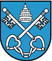 Lo stemma rappresenta due chiavi incrociate con l’impugnatura in basso, secondo la forma della croce di S. Andrea. Spesso le due chiavi sono sormontate da una tiara. La rappresentazione forse più antica di tale stemma (privo però della tiara, sostituita dall’aquila imperiale) si trova in un affresco dell’arco trionfale della chiesa parrocchiale ed è riprodotto sulla prima pagina del volume “Fonti per la storia di un borgo del Verbano: “Ascona” di Virgilio Gilardoni. Il significato delle chiavi è chiarissimo: si tratta dell’ insegna del papato e si riferisce alla pagina del Vangelo (S. Matteo, capitolo 16, versetto 19) in cui Gesù Cristo consegna al primo papa (S. Pietro) “le chiavi del regno dei cieli”. Nella stessa chiesa parrocchiale un affresco sul fianco sud dell’altare maggiore rappresenta appunto la scena della consegna delle chiavi a S. Pietro. Evidentemente le “chiavi” sono da intendersi in senso metaforico: si tratta cioè del potere di giurisdizione spirituale che il pontefice ha sui cristiani. Ma l’iconografia ecclesiastica si impossessò rapidamente di questo oggetto così ricco di significato e di emotività e raffigurò due robuste chiavi materiali che passavano dalle mani di Cristo a quelle di S. Pietro.